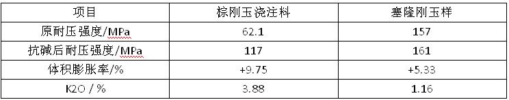由表1可以看出,要獲得相同的作業(yè)性,粗顆粒、中顆粒、細(xì)粉質(zhì)量比為58:22:20的5 #配料用水量較少,各項(xiàng)物理指標(biāo)也較好。也即增加顆粒的加入量可以提高澆注料的密度。 2.2 α-AL2O3微粉種類選擇和加入量 以5#配比為基礎(chǔ),試驗(yàn)選用編號(hào)為y、s、z、b、j、c的六種α-AL2O3,微粉做對(duì)比試驗(yàn),這六種α-AL2O3微粉的粒徑分布和比表面積各不相同。采用的六種微粉盡管粒徑分布不同,比表面積各異,但配制的澆注料的物理性能都能滿足預(yù)期要求。相比之下,含微粉 c的配料用水量更小些(3.3%),各項(xiàng)物理指標(biāo)也較好些。當(dāng)選用α-AL2O3微粉c,加入量為3%~6%時(shí),配料用水量相同,并且試樣的物理指標(biāo)也在目標(biāo)值內(nèi)。 2.3 uf-si02,種類選擇和加入量 本試驗(yàn)選用國(guó)產(chǎn)微粉和埃肯微粉做對(duì)比試驗(yàn),國(guó)產(chǎn)uf-siO2配料用水量3.5%,埃肯uf-Si02配料用水量3.3%。澆注料的物理性能見(jiàn)表2。可以看出,要達(dá)到相近的流動(dòng)性,用國(guó)產(chǎn)uf-si02時(shí),施工用水量多于用埃肯uf-SiO2的用水量,試驗(yàn)的各項(xiàng)物理指標(biāo)都不如用進(jìn)口微粉的試樣。更為嚴(yán)重的是,因?yàn)閲?guó)產(chǎn)微粉雜質(zhì)含量高,1 500℃燒后試樣發(fā)生鼓脹變形,而加進(jìn)口微粉的試樣1500℃燒后試樣外觀規(guī)整。為了制得質(zhì)量?jī)?yōu)良的預(yù)制塊,決定采用埃肯的uf—Si02。 試驗(yàn)選用埃肯微粉的加入量為3%、4%、5%、6%、7%做對(duì)比試驗(yàn),試驗(yàn)結(jié)果列于表3。由表3可以看出,當(dāng)uf—Si02加入量為3%一4%時(shí),施工用水量較大,燒后線變化也較大,當(dāng)加入量為5%~7%時(shí),施工用水量較小,各項(xiàng)指標(biāo)也在目標(biāo)值內(nèi)。 2.4水泥種類和加入量 剛玉預(yù)制塊由于位于陶瓷杯中心和風(fēng)口部位,為保證其良好的高溫性能,由配料引入的ca0必須小于0.5%,所以該澆注料應(yīng)為性能優(yōu)良的超低水泥澆注料。試驗(yàn)選用CA一75G和Seacar71兩種純鋁酸鈣水泥做對(duì)比試驗(yàn),加入量在0.5%~1.5%。結(jié)果發(fā)現(xiàn),兩種水泥當(dāng)加人量為O.5%~1.5%時(shí),各項(xiàng)物理指標(biāo)都能滿足要求。但前者雜質(zhì)略高于后者,后者性能較為穩(wěn)定,故決定采用seacar71水泥。 2.5配比確定 選用粗顆粒、中顆粒、細(xì)粉質(zhì)量比為58:22:20,其中α-AL2O3,微粉加入量為6%,uf-Si02加人量為6%,seacar71水泥加入量為l%制備了棕剛玉澆注料。 棕剛玉澆注料的抗渣結(jié)果為:切開(kāi)坩堝,無(wú)明顯的浸蝕滲透現(xiàn)象。 從抗堿試驗(yàn)來(lái)看,剛玉莫來(lái)石樣完全潰散,無(wú)一完整的。賽隆剛玉樣與棕剛玉澆注料試樣完整無(wú)裂紋,其抗堿性試驗(yàn)結(jié)果見(jiàn)表4。棕剛玉澆注料有較好的抗堿性能,但與賽隆剛玉樣相比,抗渣試驗(yàn)后體積膨脹較大,吸收的K2O也較多。