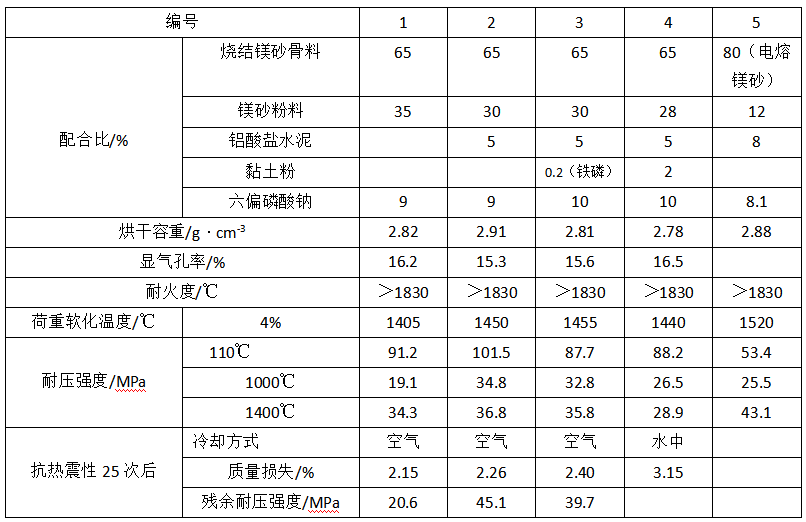 表1-1 鎂質耐火澆注料的配合比和性能