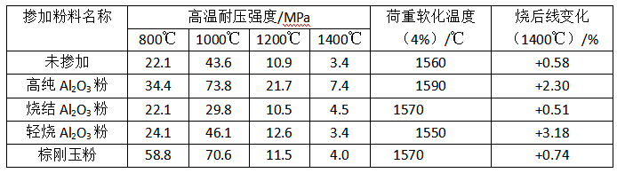 耐火粉料是基質的重要組成部分,提高耐火粉料的品級,能顯著提高黏土耐火澆注料的強度和高溫性能,如表1-1所示。在黏土耐火澆注料組成不變的情況下,用5%~20%的高品級粉料(細度不大于30um),代替部分高鋁礬土熟料粉,即能取得效果。從表中看出,用棕剛玉粉的效果好,高溫耐壓強度顯著提高,變形4%的荷重軟化溫度也提高,1400℃燒后線變化呈膨脹狀態,數值為+0.74%;高純氧化鋁粉的性能也較好,特別是1400℃高溫耐壓強度達到7.8MPa,但燒后線變化太大了。燒結氧化鋁粉的中溫強度低,輕燒氧化鋁粉的燒后線膨脹太大,因此,使用時其用量應控制在6%左右。