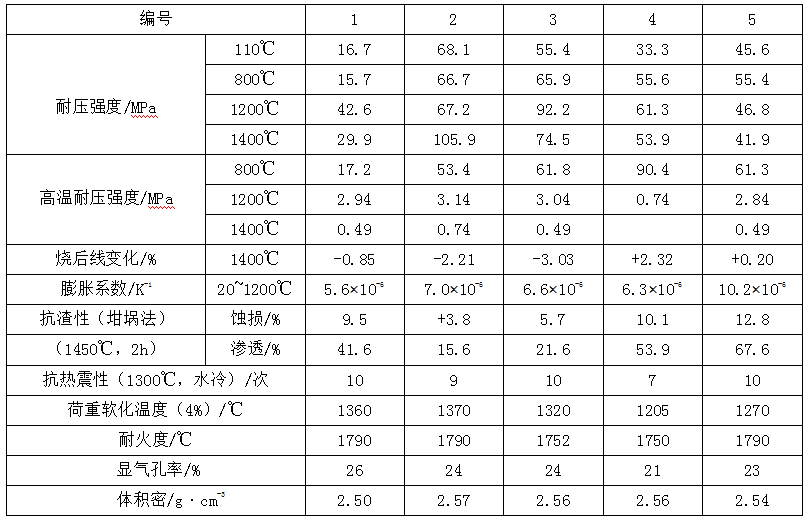 在高鋁質(zhì)耐火搗打料中,還可摻加藍晶石族礦物,借助于高溫下的分解和形成莫來石,并產(chǎn)生體積膨脹效應以抵消搗打料的部分體積收縮,有利于性能的提高。藍晶石族礦物的品位,對耐火搗打料的性能有較大影響,因此應以其精礦摻加,用量一般為15%~35%。耐火骨料和粉料用二級礬土熟料制取,骨料最大粒徑為5mm,粗、細骨料質(zhì)量比為1:1,用蘇州泥作增塑劑,用比重1.38的水玻璃溶液作結(jié)合劑。該類耐火搗打料的主要性能,見表1-4。從表中看出,摻加藍晶石族礦物后,對耐火搗打料的強度和荷重軟化溫度,無明顯作用,燒后線變化則由線收縮轉(zhuǎn)變?yōu)榫膨脹,即顯示了該類材料的膨脹劑作用。
