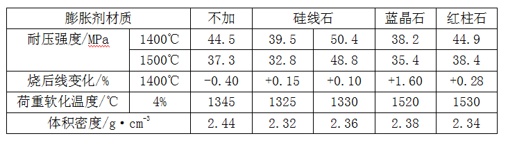 應當指出,作為膨脹劑材料,藍晶石效果最好,1400℃燒后線變化由-0.4%增加到+1.6%。