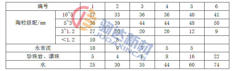 表1-1 頁巖陶粒澆注料的陶粒級配及輔料用量