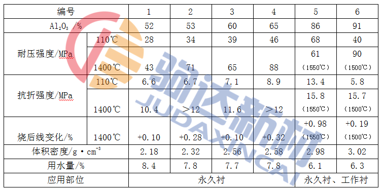 從表1-1可以看出,硅酸鋁質、鋁鎂尖晶石質和剛玉鎂尖晶石質自流耐火澆注料的性能是優良的、強度較高,燒后線變化均呈膨脹狀態,有利于使用。另外,編號1和編號2的350℃熱導率約為0.62W(m·K),也有利于保溫隔熱。