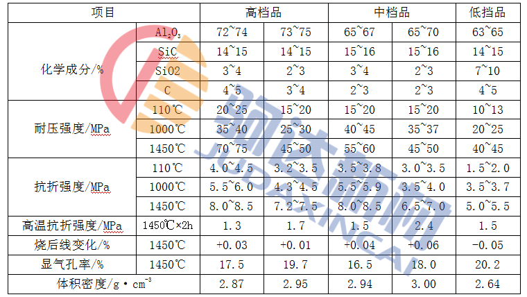 從表1-1中看出,化學成分基本相似,但性能有較大區別。高檔品的主體材料為電熔致密白剛玉,中檔品的為電熔棕剛玉,低檔品的則為優質燒結礬土熟料:隨著加熱溫度的升高,各檔次產品的強度也隨之增大,與其烘干強度相比,一般提高1~3倍。