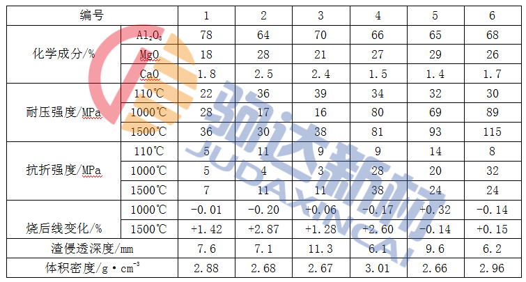 表1-2為鋁鎂尖晶石質耐火澆注料的性能。表中耐火骨料均為鎂鋁尖晶石,臨界粒徑為10mm;耐火粉細度小于0.088mm的大于90%。編號2和編號4粉料用鎂鋁尖晶石粉,編號1為電熔和燒結氧化鋁混合粉,編號3為棕剛玉和燒結氧化鋁混合粉,編號5和編號6分別為剛玉、鎂砂混合粉和兩種鋁鎂尖晶石混合粉。為了強化料的基質,還添加了α-Al2O3he Cr2O3等超微粉。選用單一或復合材料作結合劑及其外加劑。抗渣試驗為坩堝法,溫度為1650℃,保溫2h;轉爐終渣m(CaO)/m(SiO2)比為2.75.按配合比的技術要求,水用量為5%~6.2%。試樣振動成型、自然養護3d后,再檢測各種性能。