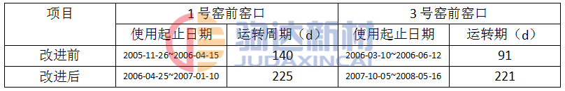 改進前后對比如表1所示。經(jīng)過全方位優(yōu)化改進后,窯口澆注料使用壽命實現(xiàn)了質的飛躍,更換周期不但滿足了窯磚檢修的需要,甚至明顯超過了窯磚壽命,避免了檢修時廢舊澆注料難拆除的被動局面,自檢修以來,未再發(fā)生過因窯口澆注料而停窯檢修的情況。