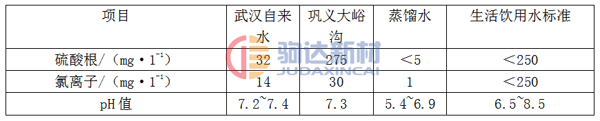 空氣中的酸性氣體CO2、CO2、H2S是高鋁澆注料發(fā)生碳酸化和硫酸化現(xiàn)象的原因之一,而現(xiàn)場(chǎng)澆注料用水質(zhì)量也不容忽視,尤其是水中的SO42-和H+,對(duì)高鋁水泥水化物也起一定的侵蝕作用。表2為幾種水源質(zhì)量對(duì)比。與武漢地區(qū)水源相比,鞏義大峪溝生產(chǎn)現(xiàn)場(chǎng)所用的水,其[SO42-]和[Cl-]指標(biāo)高,其中[SO42-]超出了國(guó)家底面生活飲用水標(biāo)準(zhǔn),而蒸餾水中[SO42-]超出了國(guó)家地面生活飲用水標(biāo)準(zhǔn),而蒸餾水中[SO42-]和[Cl-]最低。這與生產(chǎn)現(xiàn)場(chǎng)附近有一個(gè)硫酸廠不無關(guān)系。