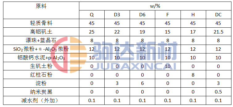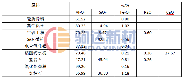 試驗(yàn)用原料有:合成輕質(zhì)骨料、高鋁礬土熟料、漂珠、藍(lán)晶石、二氧化硅微粉、氧化鋁微粉、純鋁酸鈣水泥、以及造孔劑生礬土粉、紅柱石、淀粉、納米炭黑等。原料的化學(xué)組成見表1。