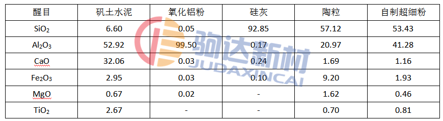 試驗用原材料為礬土水泥,陶粒,氧化鋁粉,硅灰,自制超細粉(粘土質),分散劑等。其化學成分如表1。