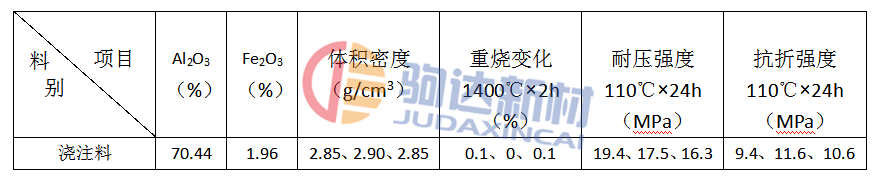 高鋁磷酸鹽耐火澆注料是采用PA-80膠結(jié)合的澆注料。它具有高強快硬、粘結(jié)強度大、施工周期短的優(yōu)點,是熱工窯爐搶修澆注、冷補、熱補常用的耐火材料(表1)。