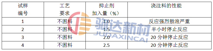 高鋁磷酸鹽澆注料采用不困料。添加抑止劑是項施工新工藝,但關(guān)鍵是控制好抑止劑的加入量。我們以高鋁礬土為原料(Fe2O3<1.5%),以江蘇武進生產(chǎn)的PA-80膠作結(jié)合劑,反復(fù)實驗抑止劑適宜的加入量為2~2.5%,試驗情況見表4。