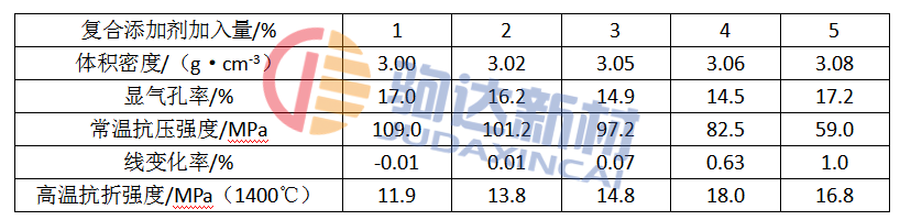 表2 復(fù)合添加劑對1500℃3h燒后澆注料性能的影響