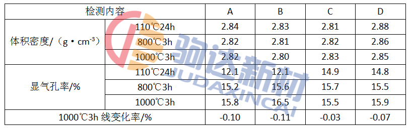 由表3結果,減少純鋁酸鈣水泥的用量,試樣的烘干強度也隨之降低,表明在常溫下試樣的強度主要由純鋁酸鈣水泥提供。用活性α—Al2O3替代部分煅燒α—Al2O3,可使其在較低溫度下發(fā)生水化或與體系中的SiO2發(fā)生反應生成莫來石,與純鋁酸鈣水泥共同作用提高了樣品的耐壓強度及高溫抗折強度,表現(xiàn)為A和B配方結果之差。添加廣西白泥,其礦物成分主要是高嶺石,使體系在800℃左右開始出現(xiàn)液相。促進澆注料體系在中溫下的燒結,表現(xiàn)為C配方具有較高的1000℃燒后冷態(tài)強度;D配方含有較高的活性α—Al2O3微粉和較低的水泥用量,因此其1000℃以下的強度較低,但其1000℃熱處理后的冷態(tài)強度提高顯著,可能因為水泥水化物比較少,加入引起的水化物結構變化及體積變化比較小,同時活性α—Al2O3微粉及SiO2微粉與純鋁酸鈣水泥共同作用形成的網狀結構可以保持其形狀至較高溫度,高溫下其與體系中其他物質的反應程度也比較高,從而提高了樣品經1000℃熱處理后的冷態(tài)強度。表4是各配方樣品不同熱處理溫度后的體積密度、縣氣孔率加熱永久線變化的結果。