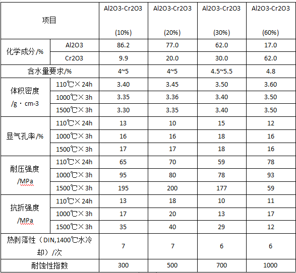 鉻剛玉耐火澆注料主要化學(xué)成分是Al2O3和Cr2O3,采用Cr2O3-Al2O3混合料配置的耐火澆注料具荷重軟化溫度高、高溫耐壓強(qiáng)度高、高溫抗折強(qiáng)度高、抗侵蝕性強(qiáng)、致密性好的優(yōu)點(diǎn)。原則上鉻剛玉耐火澆注料是可以采用任何比例的Cr2O3/Al2O3比例。鉻含量越好的鉻剛玉耐火澆注料,其耐壓強(qiáng)度、抗折強(qiáng)度、抗渣侵蝕性能越高。表1列出了不同鉻含量的鉻剛玉耐火澆注料的性能指標(biāo)。