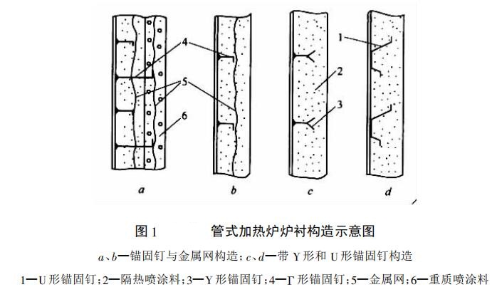 圖1為管式加熱爐爐襯構造示意圖。圖中a為錨固釘與雙層金屬網組成錨固系統,并用輕、重質料噴涂;b為一層金屬網用錨固釘固定,與C和d一樣,均用隔熱噴涂料施工。