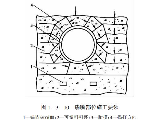 搗打耐火可塑料爐墻時(shí),首先將料坯緊密無(wú)間的平擺起來(lái),只準(zhǔn)擺一層料坯。工作面 側(cè)應(yīng)安放完整無(wú)損的料坯,其內(nèi)側(cè)允許安放掉角、破損的料坯或修整下來(lái)的碎料;其次用搗固機(jī)或風(fēng)鎬搗打,錘頭沿爐墻長(zhǎng)度方向行走,錘頭面應(yīng)疊壓1/4左右。整個(gè)料坯面搗打2~3遍即可錯(cuò)縫鋪置下一層料坯,然后繼續(xù)搗打,依此類推;第三,當(dāng)遇到錨固磚時(shí),將爐墻可塑料搗打至錨固磚上表面,在安裝磚的位置挖去部分料,放置壓模,打進(jìn)可塑料中,當(dāng)達(dá)到安放錨固磚的尺寸時(shí),將壓模取出,安裝錨固磚。這樣能使錨固磚與耐火可塑料緊密咬合,防止竄火,同時(shí)也防止?fàn)t墻內(nèi)傾或倒塌;第四,當(dāng)遇有孔洞時(shí),例如燒嘴部位,其施工要領(lǐng)見圖2。當(dāng)爐墻搗打面至燒嘴下表面約為100mm時(shí),牢固地安裝胎模,一層層的鋪料坯,分層進(jìn)行搗制。每層施工時(shí),先搗打胎模周圍料坯,再打水平鋪的料坯,最后封口。