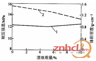 圖1 漂珠用量與性能的關系1 一耐壓強度;一體積密度應當指出,漂珠用量由10%增至15%時,使澆注料的體積密度達到1.07g/cm3,烘干耐壓強度為9.2 MPa,1200℃燒后線收縮約為0.32%。這就是說,在輕質耐火澆注料中,漂珠用量一般為5%~15%為宜。